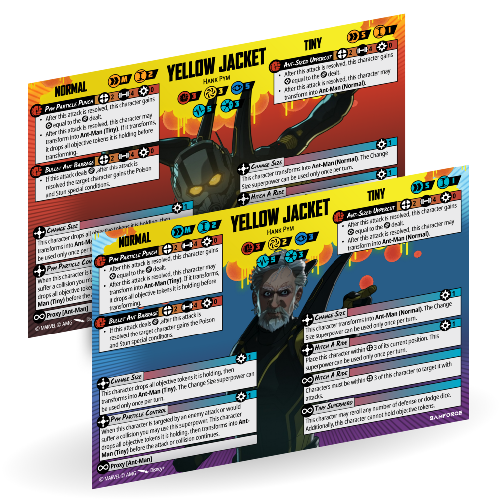 This release comes with both healthy and injured versions of Yellow Jacket. These cards use the same stats and abilities as the official Ant-Man release, so you can use these cards without worrying about balance.